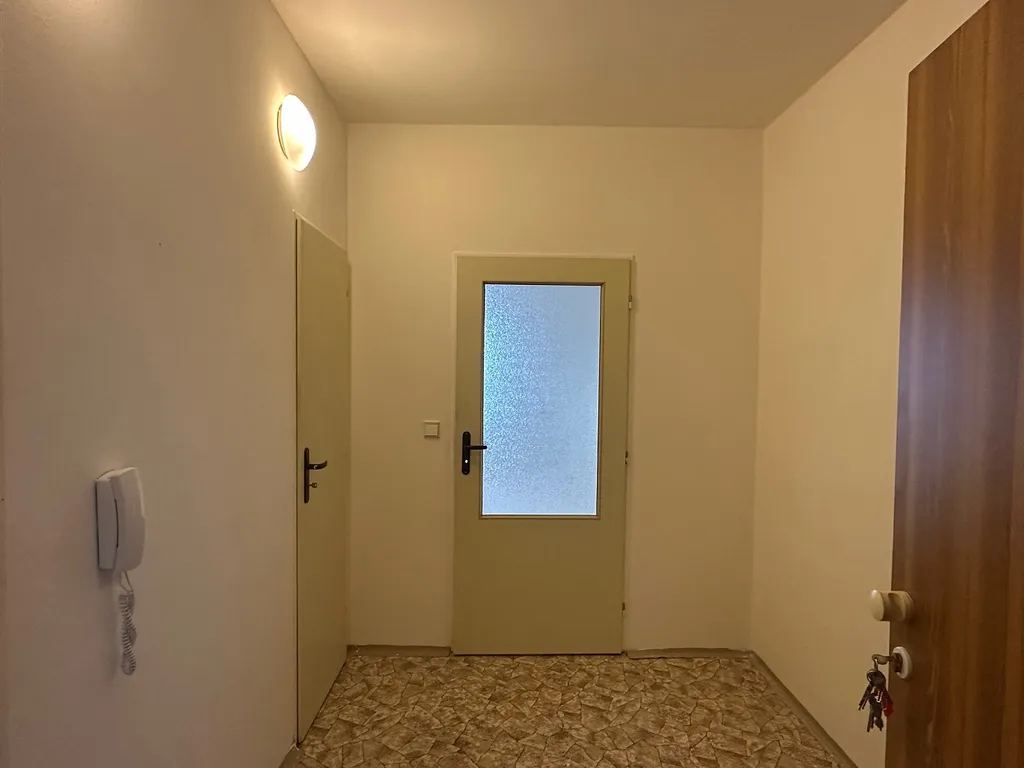 Dispozice bytu - obývací pokoj s kuchyňským koutem (21 m² - zkoseno) + koupelna se zděným sprchovým koutem, přípojka na pračku, samostatné WC, předsíň (6 m²)- pouze dvě střešní okna / plastová z roku 2023, aktuálně nově bíle vymalováno a pečlivě uklizeno. Byt je umístěn na konci uzavřené pavlačové chodby, výtah, sklepní koje.