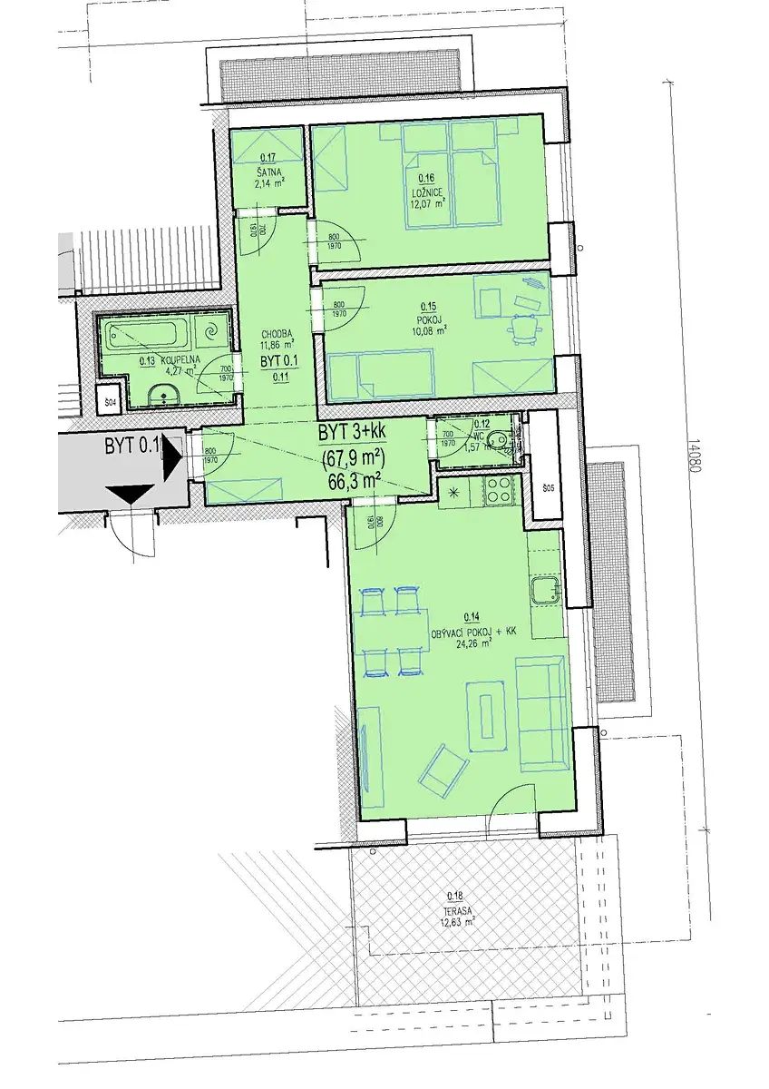 - byt 0.2. - o velikosti 54,10 m2 bez sklepa + terasa 31,19 m2 za cenu 6.960.000,- Kč v 1.PP domu CD22