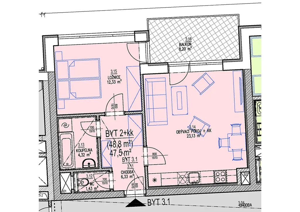 - byt 3.1. o velikosti 48,80 m2 bez sklepa + balkon 8,20 m2 za cenu 6.500.000,- Kč ve 3.NP domu CD22