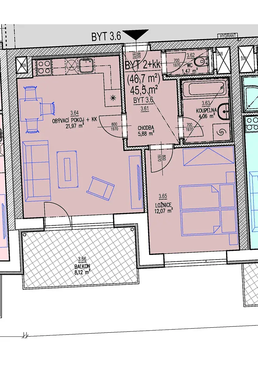 - byt 3.6. o velikosti 50,36 m2 včetně sklepa + balkon 8,12 m2 za cenu 6.487.900,- Kč ve 1.NP domu CD22