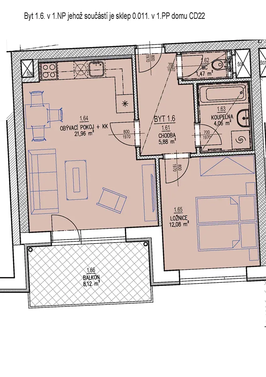 - byt 1.6. o velikosti 51,37 m2 včetně sklepa + balkon 8,12 m2 za cenu 6.323.550,- Kč ve 1.NP domu CD22