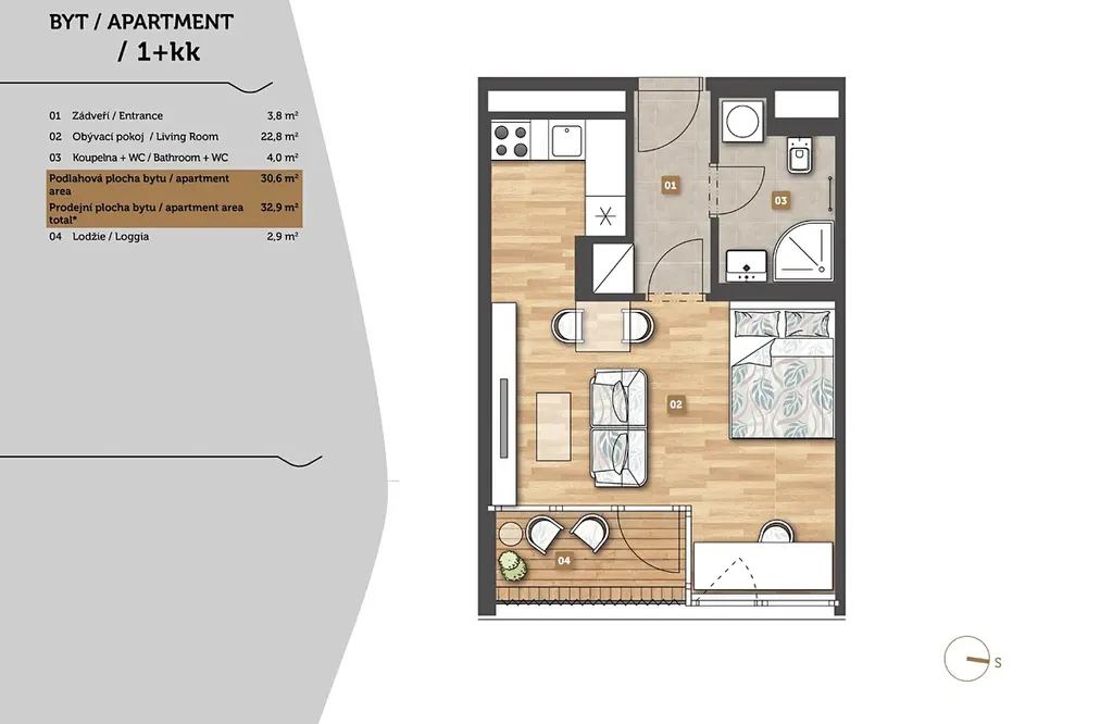 Byt disponuje podlahovou plochou 33 m² a je umístěn ve třetím patře domu s výtahem, což zajišťuje snadný přístup. Dum byl zkolaudován v roce 2022 a je navržen s důrazem na pohodlí a funkčnost moderního bydlení. Byt je realizován v vysokém standardu: