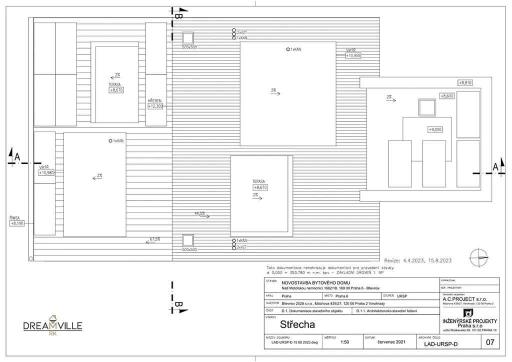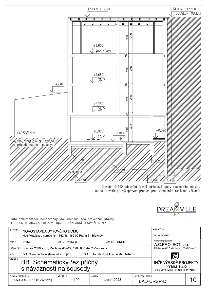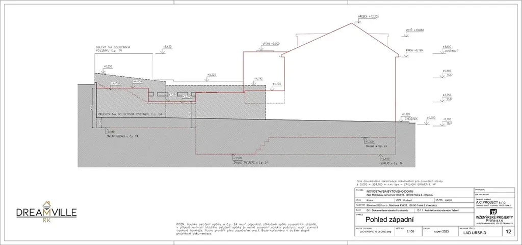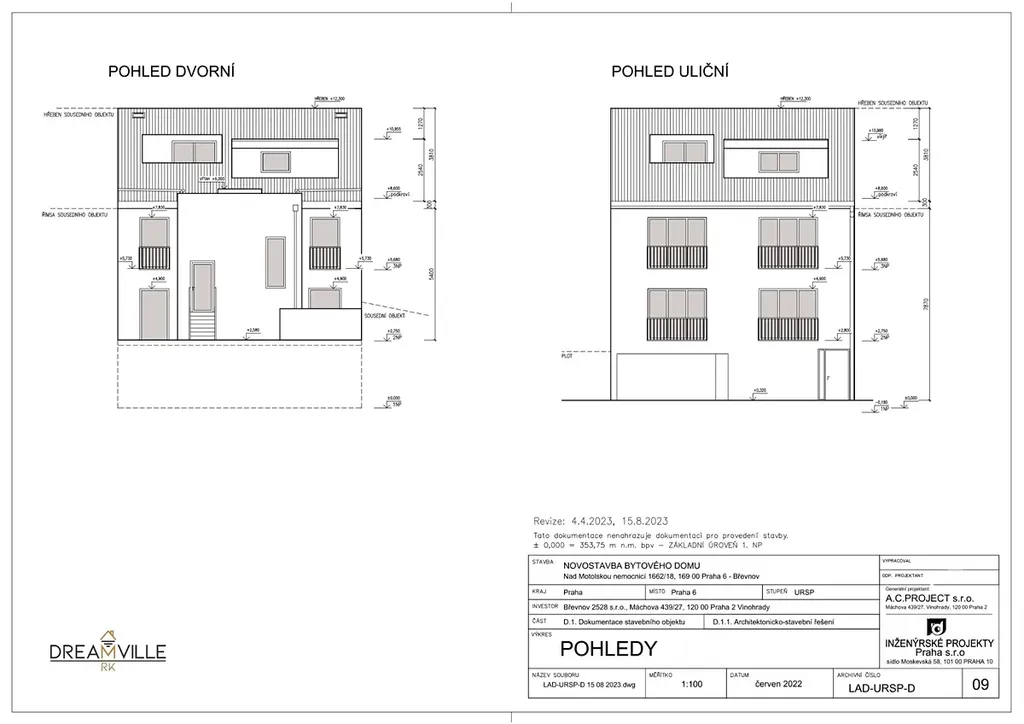 Dovolujeme si Vám nabídnout k prodeji projekt na výstavbu bytového domu nacházející se v klidné části Břevnova. Jedná se o projekt se stavebním povolením na výstavbu čtyř bytových jednotek, každá byt bude mít své parkovací stání v garáži a sklep. Bytový dům bude vybaven výtahem a je navržen s ohledem na bezbariérový přístup.