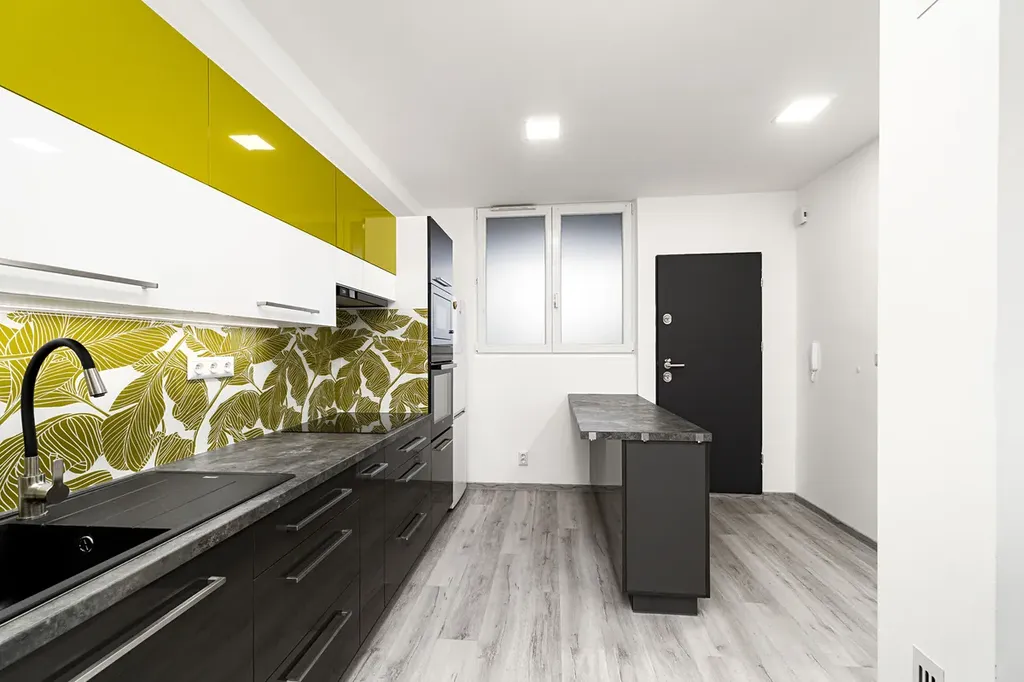 Byt je rozdělen do dvou úrovní. Po vstupu do bytu se ocitnete v útulné kuchyni, která je vybavena elektrickou indukční varnou deskou, vestavěnou elektrickou troubou a mikrovlnnou troubou. Disponuje také kuchyňským ostrůvkem, díky němu má kuchyň moderní vzhled a dostatek úložného místa. Kuchyň má také přípojky na myčku a pračku, což usnadňuje běžný provoz domácnosti. Ve spodní části bytu se nachází prostorný a slunný obývací pokoj, ideální pro odpočinek a rodinné posezení, a toaleta.