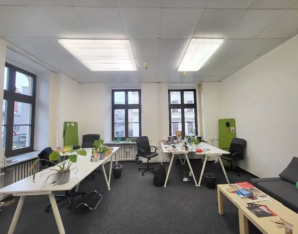 Prostor tvoří jedna velká kancelář, jedna menší kancelář a předsíňka s kuchyňskou linkou. Kancelář je vymalovaná na bílo, na podlaze je položen koberec. Vybavení kanceláře není součástí nájmu.