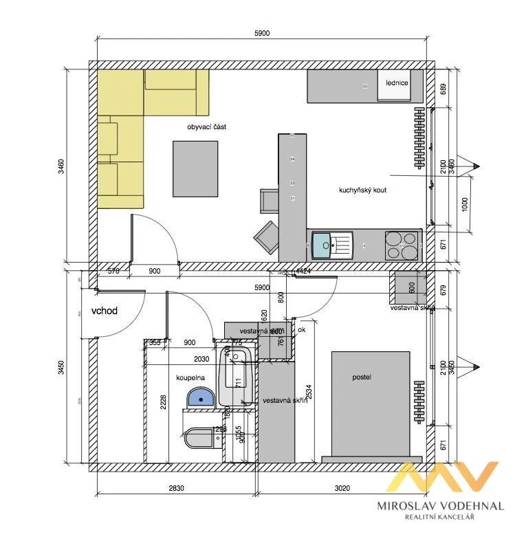 Dispozice: obývací pokoj s kuchyňským koutem, ložnice, koupelna s WC, předsíň, komora, sklepní kóje.