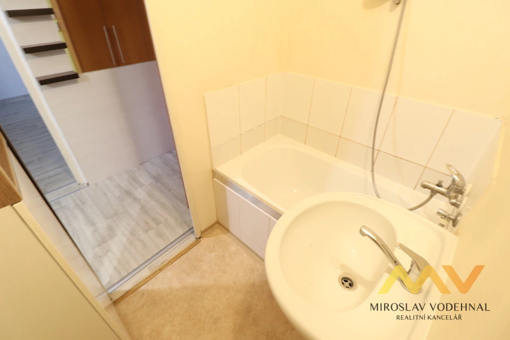 Jedná se o byt v osobním vlastnictví s důmyslnou změnou dispozice z původní 1+1 na 2+kk. Obývací pokoj je spojen s kuchyňským koutem a z původní kuchyně je nyní ložnice. Jádro umakartové, renovovaná koupelna s minivanou a WC. Kuchyňský kout s pultem je vybaven linkou s el. troubou a sklokeramickou varnou deskou. V ložnici a v předsíni vestavěné skříně. Za posuvnými dveřmi je praktická komora.