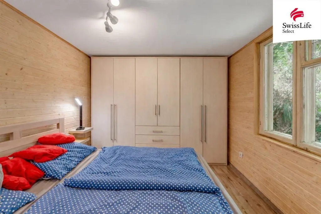 Nemovitost má dvě podlaží. Obytné patro o výměře 70 m nabízí velmi vzdušný a otevřený interiér. Dominantou je prostorný obývací pokoj, na který navazuje kuchyň. Dále se zde nachází ložnice a koupelna s toaletou. Interiér je proveden ve dřevě, což vytváří nadstandardně útulný, ale zároveň reprezentativní dojem. Spodní podlaží o výměře 24 m slouží jako technické zázemí, ideální pro skladování, dílnu nebo technickou místnost.