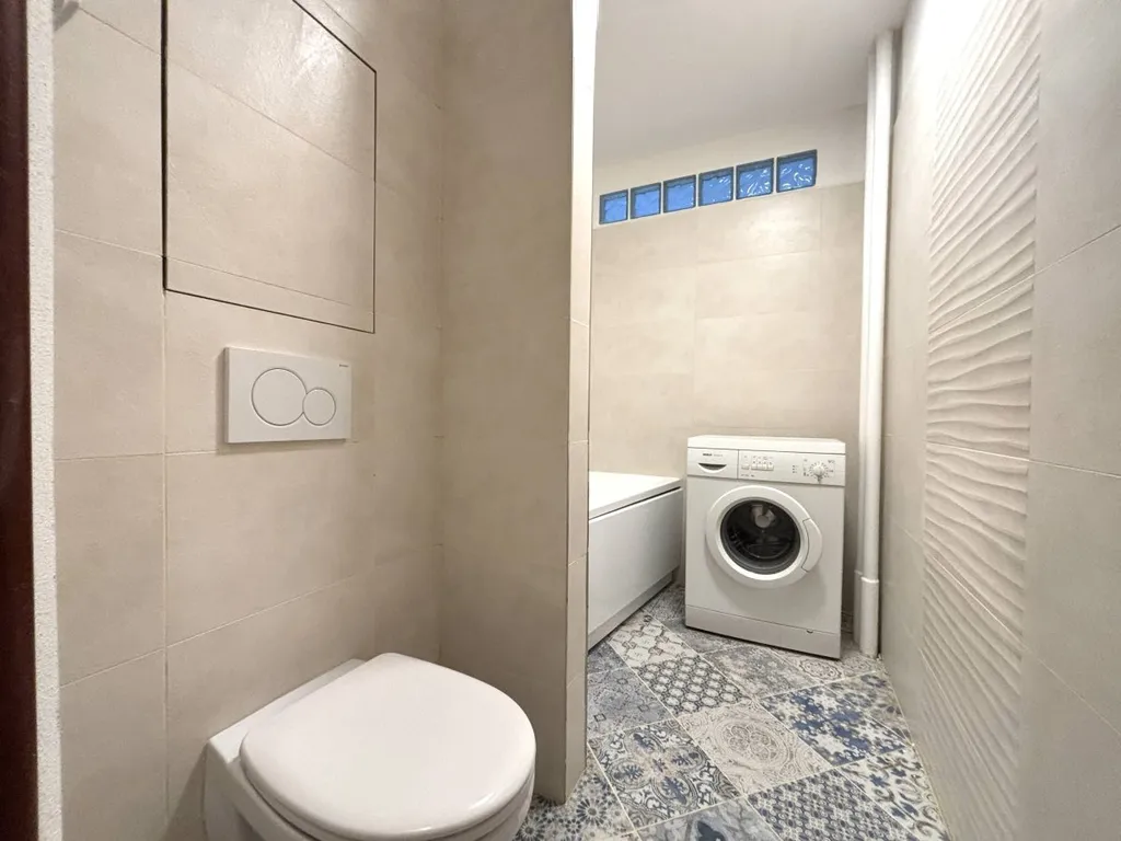 Koupelna je zařízena vanou, umyvadlem a zrcadlem s osvětlením a pračkou.