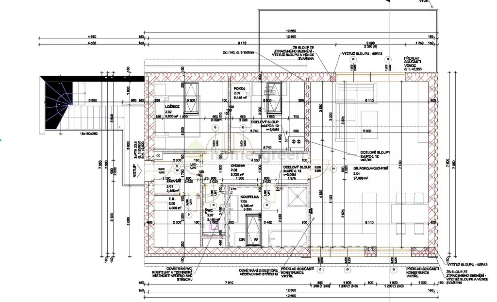 V 1.NP potom vybudovat na obytné ploše 32 m2 jeden pokoj, sprchu, WC a chodbu s východem na oplocenou zatravněnou zahradu. V zahradě je vchod do dvou sklepních místností.