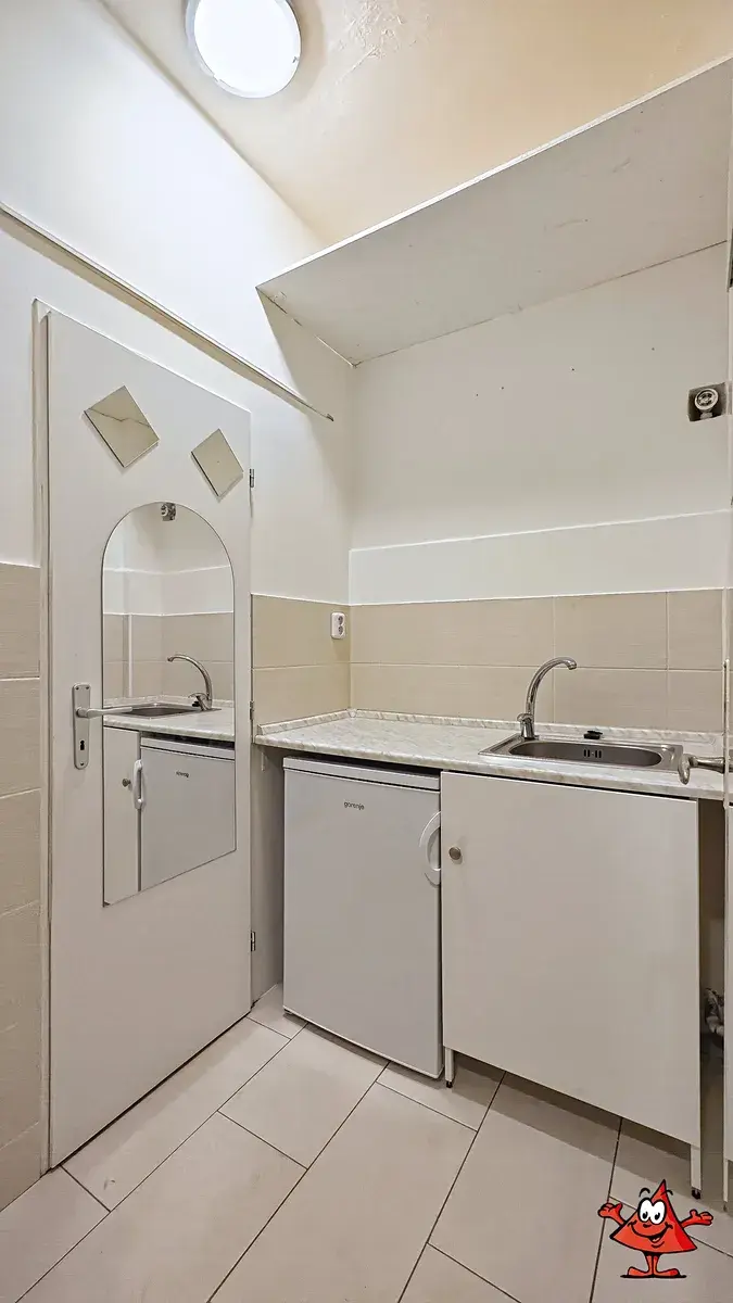 Prostor je vhodný pro práci 2-3 osob, zaveden optický internet a videotelefon. Dispozičně je kancelář řešena jako hlavní místnost s předsíní a sociálním zázemím. Po předchozím nájemci byly provedeny základní opravy a vymalováno - vše je bezchybně funkční. Okna jsou orientována do klidného vnitrobloku a jsou téměř v úrovni prvního patra. Díky velkému oknu je prostor světlý, díky vlastní kotelně v domě jsou náklady na vytápění a provoz nízké. V hlavním prostoru je vestavěná skříň, v předsíni další úložné prostory, zázemí s kuchyňkou osazeno novou lednicí. Nábytek na fotografii hlavní místnosti není součástí nájmu, patří předchozím nájemcům a slouží pouze pro ilustraci.