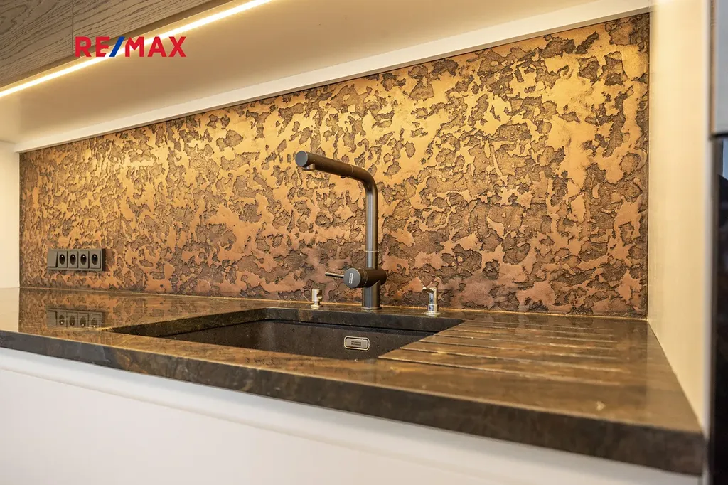 Dominantou bytu je světlý obývací pokoj s kuchyňským koutem, kde vás zaujme designová stěrka od společnosti Němec a kuchyňská linka na míru z dílny truhláře, osazená kamennou pracovní deskou. Kuchyňský ostrůvek je chytře řešený – zabudované židle lze pohodlně vysunout a zasunout, čímž šetří prostor a zvyšují praktičnost.