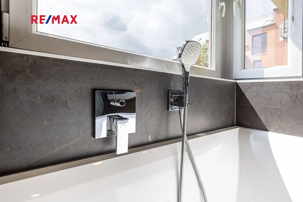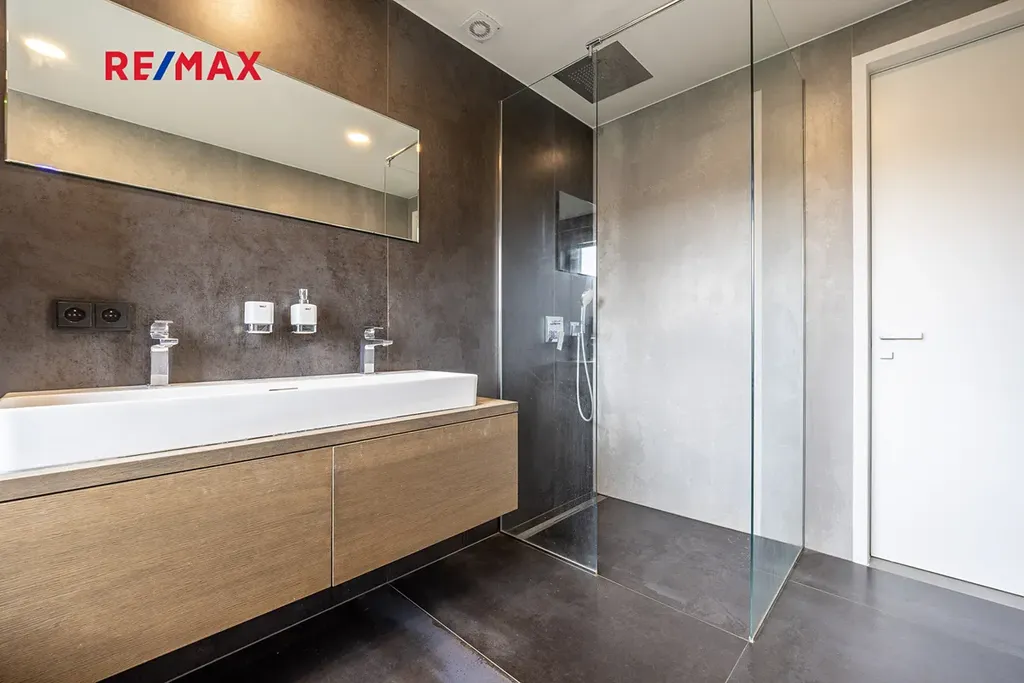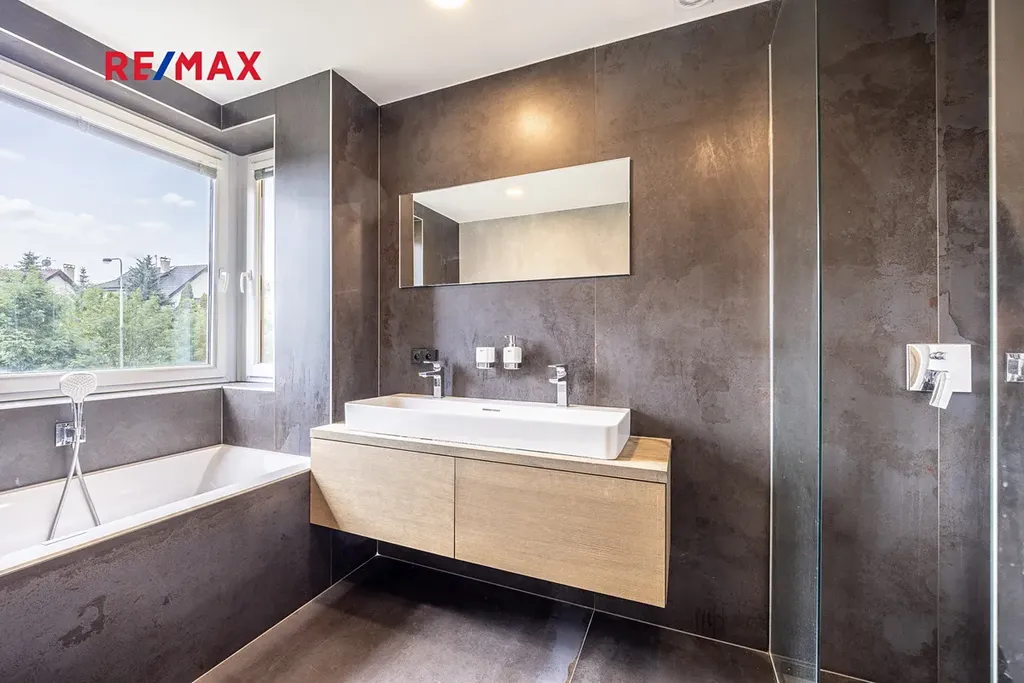 Koupelna kombinuje vanu, sprchový kout a WC a byla vybavena velkoformátovými obklady a dlažbou značky Villeroy & Boch. K dispozici je také samostatné WC a praktická technická místnost.
