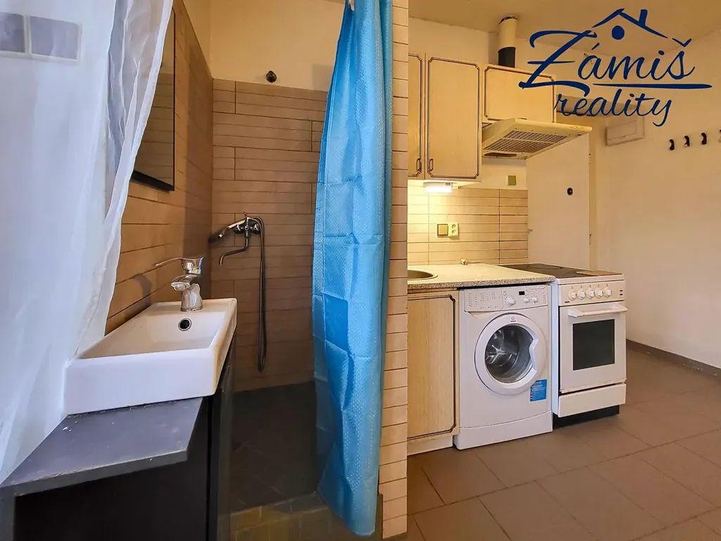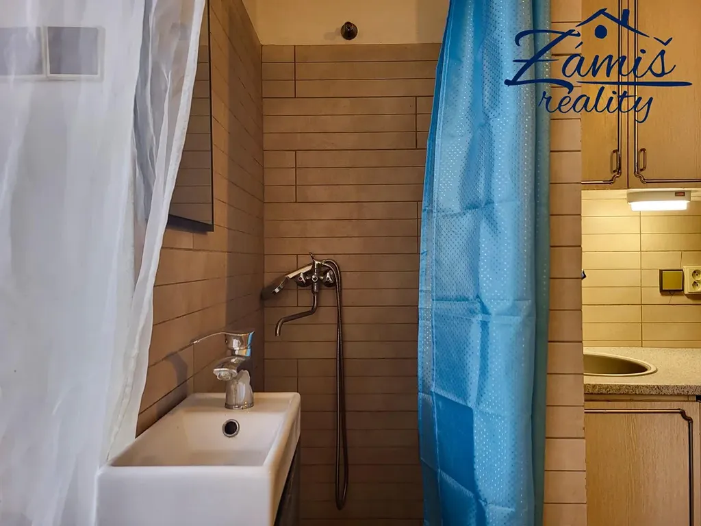 Kuchyně je vybavena kuchyňskou linkou se sporákem, sprchový kout je umístěn vedle kuchyně. Jinak je byt bez vybavení.