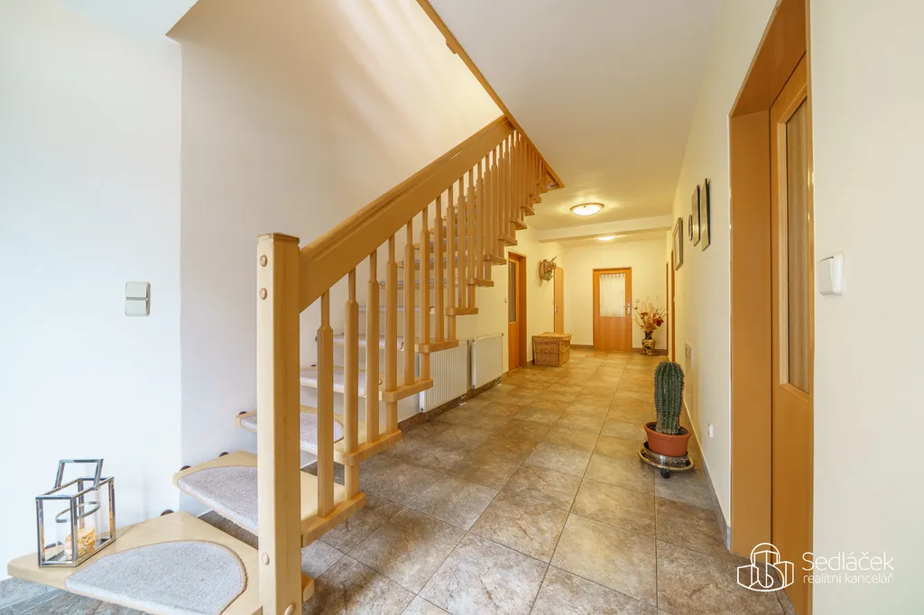 Prakticky řešené technické zázemí domu: vstupní chodba, šatna, pracovna, kotelna, technická místnost a sušárna s pracovní koupelnou. Podlaží je ideální jak pro provozní účely, tak pro klidnou práci z domova.