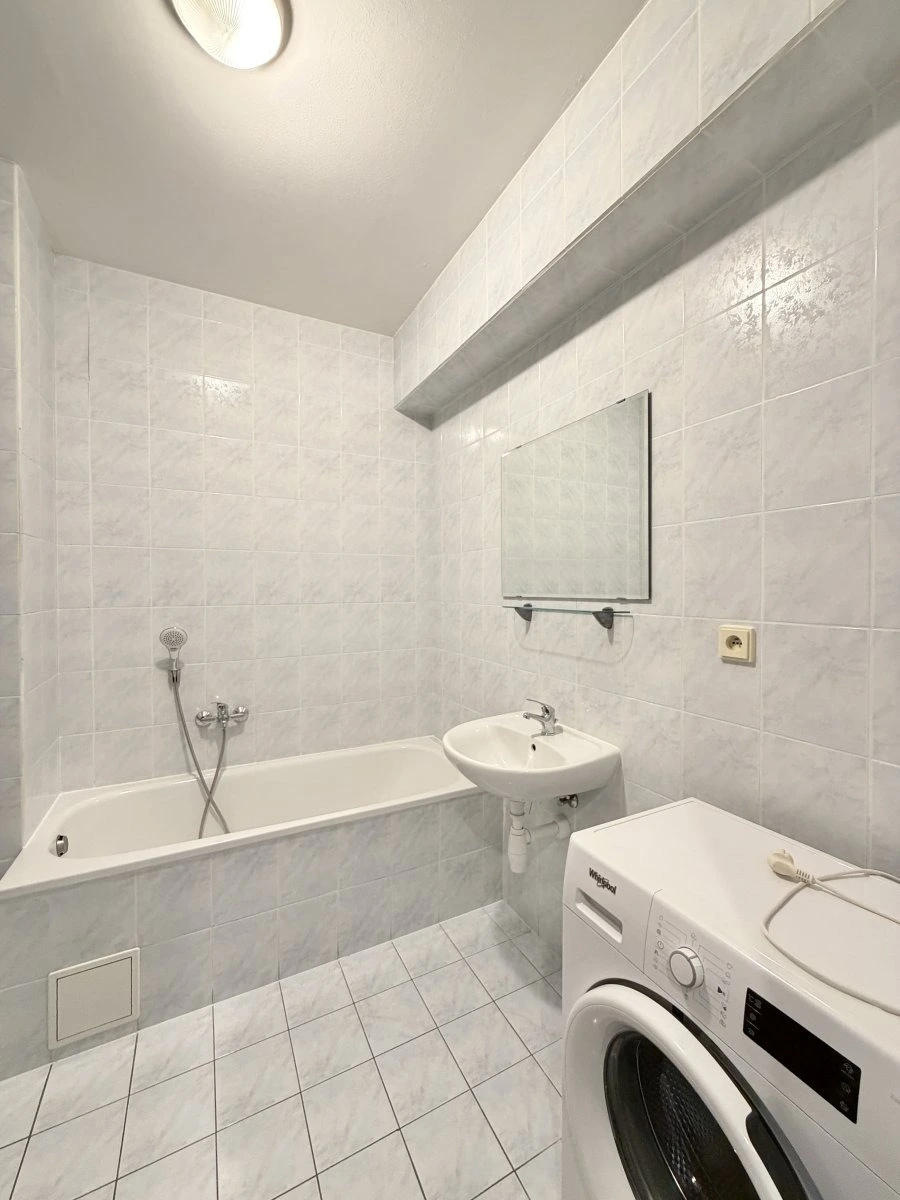 Byt se nabízí částečně vybavený. Kuchyně disponuje lednicí, elektrickým sporákem a digestoří. Obývací část je nezařízena. V koupelně je vana, umyvadlo, toaleta a topný žebříček.