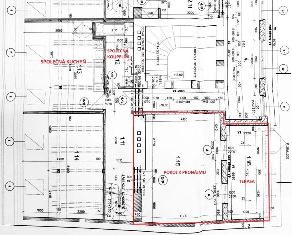 Pokoj se sdílenou kuchyní a koupelnou se nachází v 5. nadzemním podlaží cihlového domu,