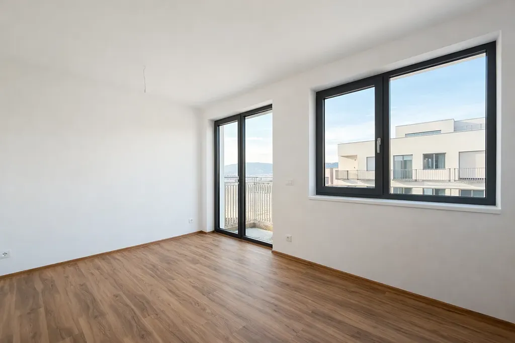 Hlavní obytný prostor tvoří světlý obývací pokoj s přípravou pro kuchyňskou linku, místem pro jídelní stůl a velkými balkonovými dveřmi, které vedou na rohový balkon o ploše 12 m².