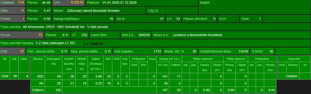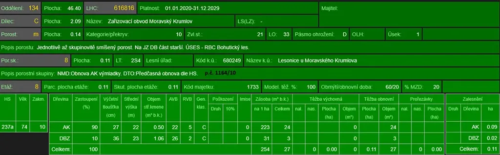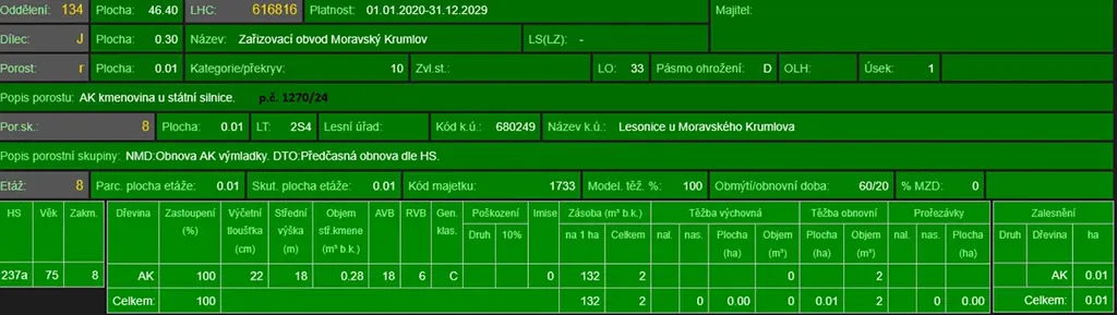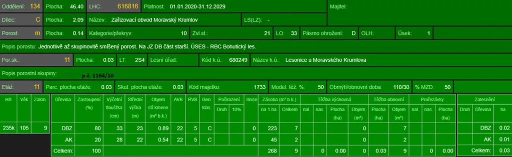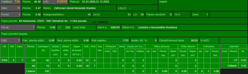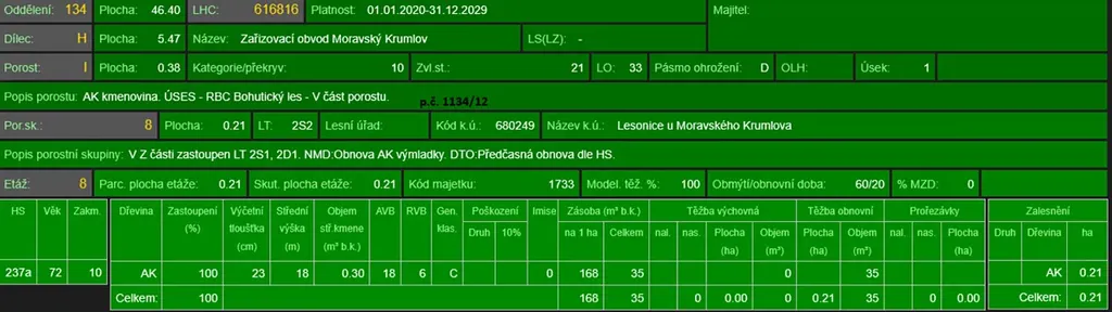 - p.č. 1134/12 vedená jako lesní pozemek o celkové výměře 3 810 m2, z toho vlastníme podíl 2/3 tedy 2 540 m2 (stáří lesa 104 let - zastoupení dřevin dub, akát, stáří lesa 78 let - zastoupení dřevin akát, stáří lesa 10 let - zastoupení dřevin dub, akát),