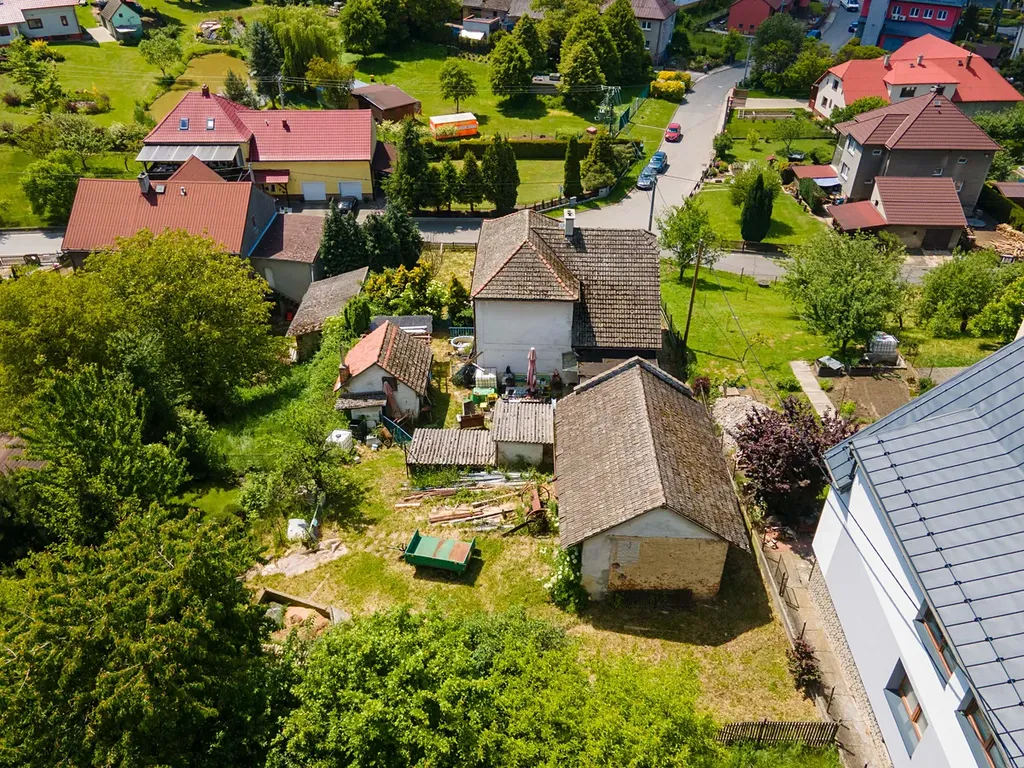 Exkluzivně nabízíme k prodeji rodinný dům nedaleko centra obce v Darkovicích. Dům je prostorný a celopodsklepený. Dispozičně v 1.NP se nachází veranda, WC a spíž, prostorná chodba se schodištěm, vstupem do dětského pokoje a koupelny, kuchyně a obýváku. Ve 2. NP se nachází vstup na půdu, pracovna, komora a ložnice. K domu náleží tři hospodářské budovy, pergola a garáž. Pozemek je svažitý orientovaný jižně. Pro představu možnosti úprav místností a pozemku, jsme zpracovali vizualizace. Elektřina v domě je částečně v mědi, voda a kanalizace je v plastu a napojená na obecní vodovod a kanalizaci.