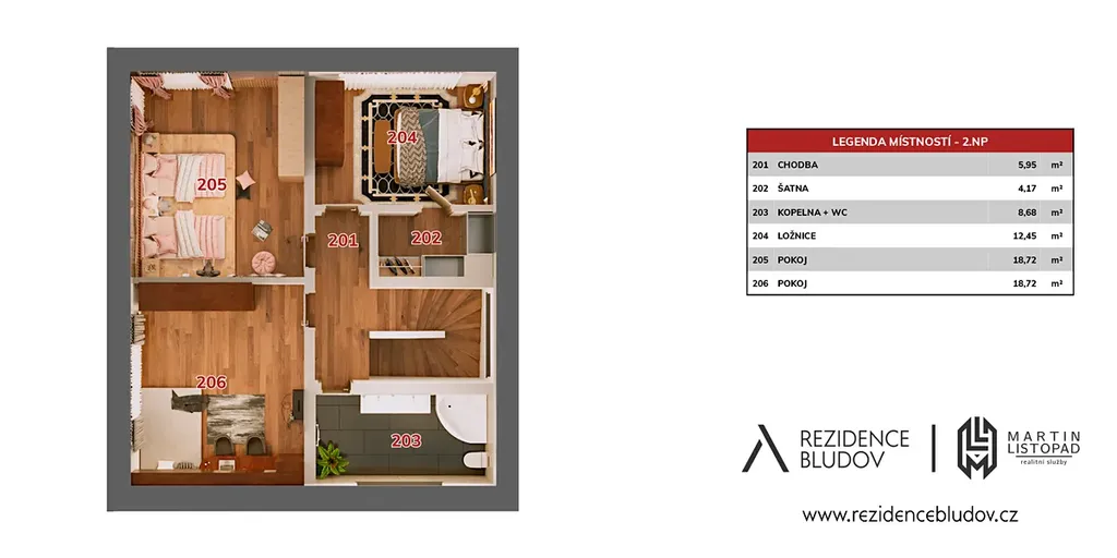 Ve 2. NP je hlavní ložnice s vlastní šatnou, dva neprůchozí pokoje a prostorná koupelna se sprchovým koutem, vanou a toaletou.