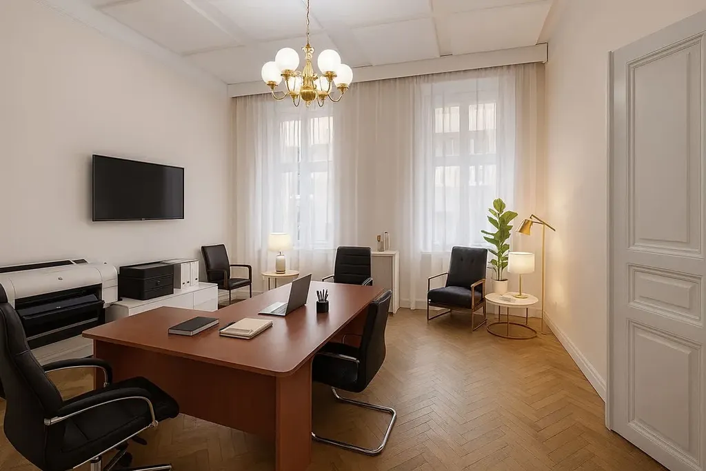 Prostory jsou světlé, vzdušné a velmi reprezentativní. Nabízejí vysoké stropy s akustickou úpravou, klimatizaci, kvalitní dřevěné parkety a elegantní bíle lakované interiérové dveře, které podtrhují nadčasový a profesionální charakter interiéru.