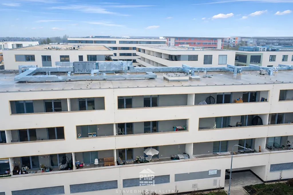 Byt disponuje prostornou terasou, která poskytuje příjemný prostor k relaxaci a posezení a je přístupná z obou obytných místností. Dispozičně je byt řešen jako obývací pokoj s kuchyňským koutem, samostatnou ložnicí, nadstandardně prostornou koupelnou s vanou i sprchovým koutem, samostatným WC a vstupní chodbou. Kuchyňská linka je vybavena vestavěnými spotřebiči – lednicí, myčkou nádobí, troubou, indukční varnou deskou a digestoří. Nábytek není součástí pronájmu.