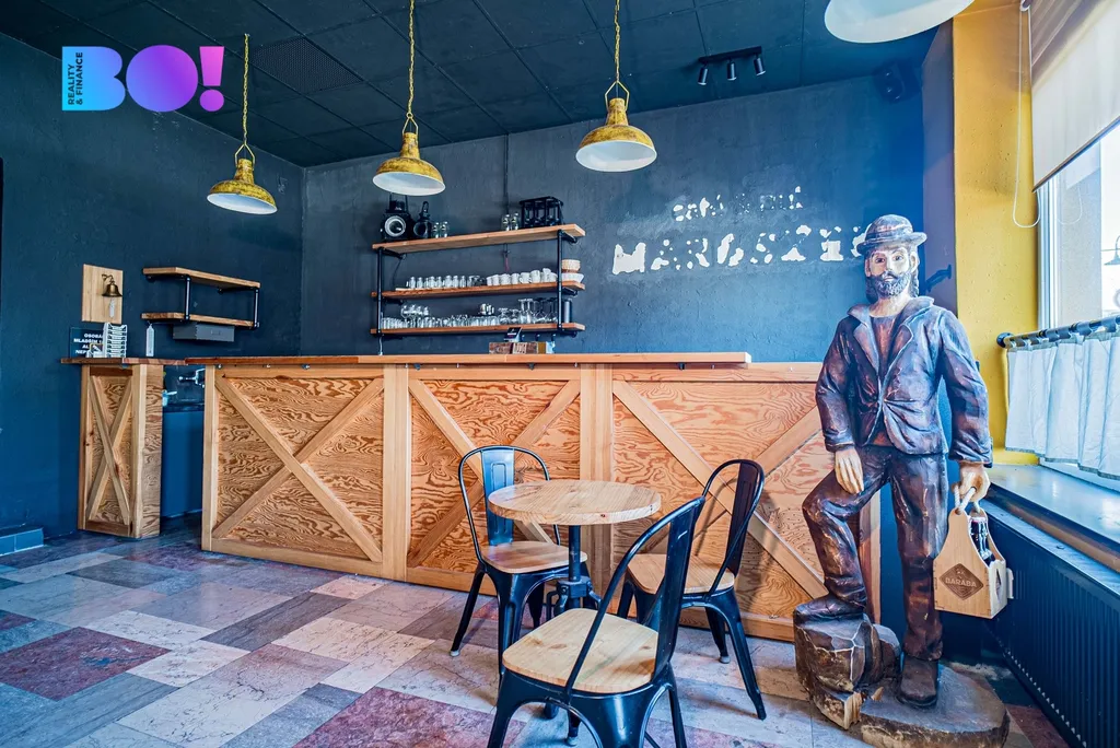 Prostor má osobitý industriální charakter s atmosférou moderního pubu. Interiéru dominují přiznané cihlové zdivo, tmavé tóny, dřevo a kovové prvky, které společně vytvářejí stylové a zapamatovatelné prostředí. Součástí je bar s otevřenými policemi a výrazným čelním obložením. Velká okna orientovaná do ulice zajišťují dostatek denního světla a výbornou prezentaci provozu směrem ven.