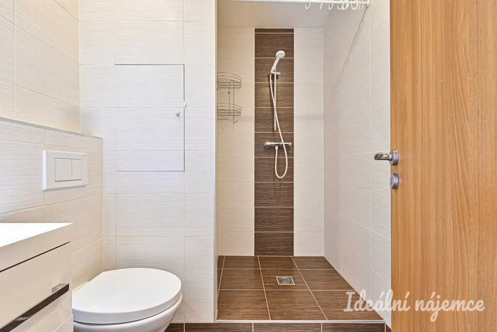 Koupelna je zařízena sprchovým koutem, umyvadlem se skříňkou a toaletou.