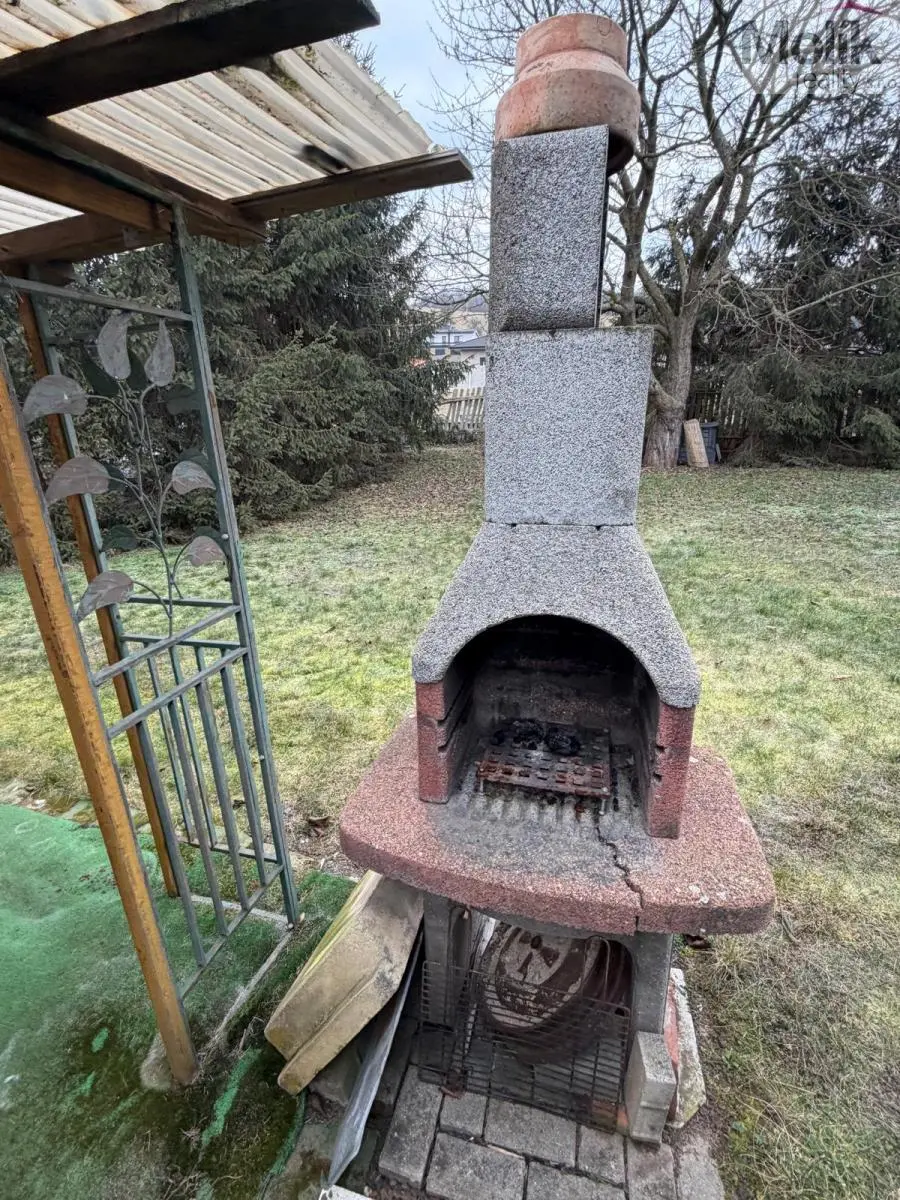 Na pozemku se nachází kůlna (bez připojení k elektřině, vhodné pro uskladnění nářadí či materiálu), a k dispozici je také zahradní posezení s přístřeškem a venkovním grilovacím krbem.