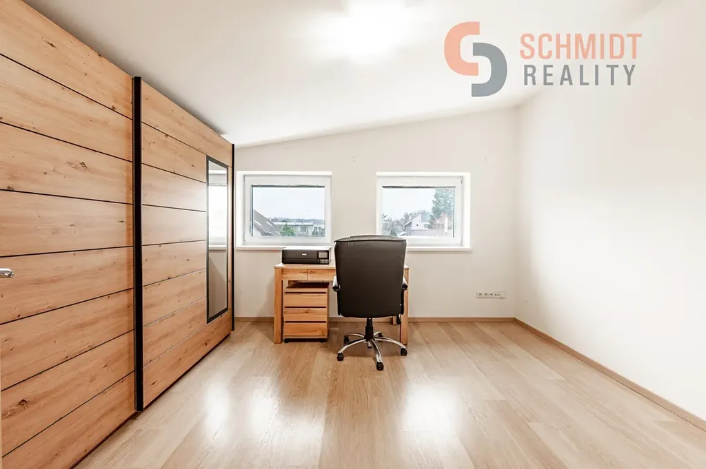 - Ve druhém podlaží najdeme dva dětské pokoje situované do ulice, koupelnu a dále ložnici, která je průchozí do pracovny. Oba tyto pokoje jsou situované