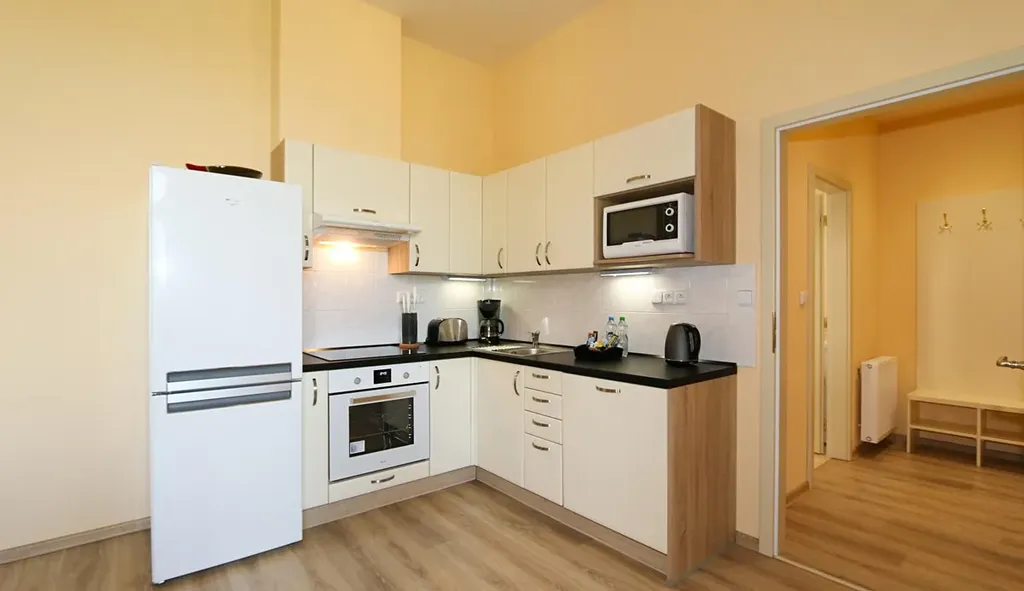 Interiér bytu je zařízený a dispozice nabízí vstupní chodbu, obývací pokoj s plně vybaveným kuchyňským koutem, hlavní ložnici s vestavěnou šatní skříní, druhou menší ložnici a moderní koupelnu. Další vybavení bytu: trouba, sporák/trouba, mikrovlnná trouba, varná konvice, kávovar, toustovač, TV, satelitní přijímač, WiFi.