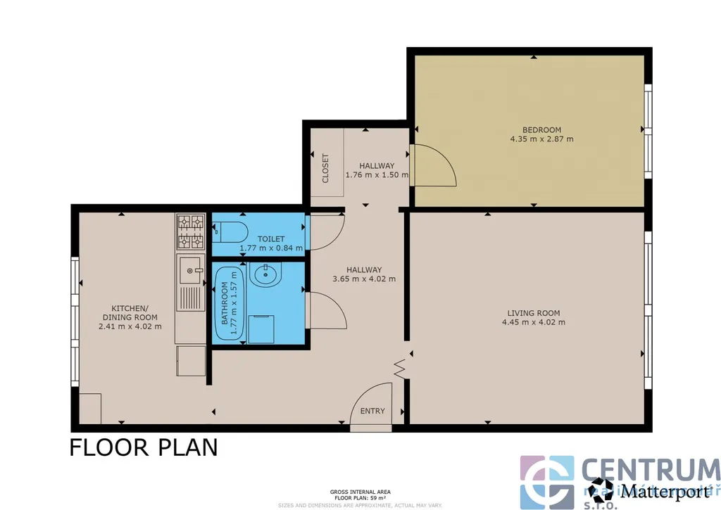 Dispozice zahrnuje obývací pokoj, ložnici, samostatnou kuchyň, koupelnu, oddělenou toaletu a prostornou předsíň. K bytu náleží také sklepní kóje.