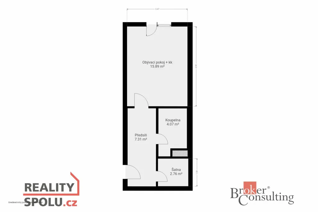 Bytová jednotka je rozdělena na vstupní chodbu, koupelnu s toaletou, obývací část včetně kuchyňské linky a úložný prostor.