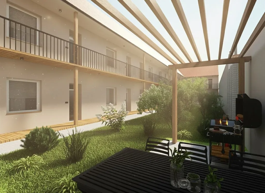 Velkou přidanou hodnotou domu je společný zabezpečený vnitroblok, který nabízí klidnou zelenou zónu vhodnou k posezení, relaxaci či grilování.