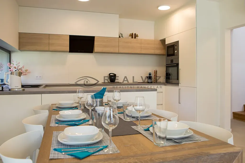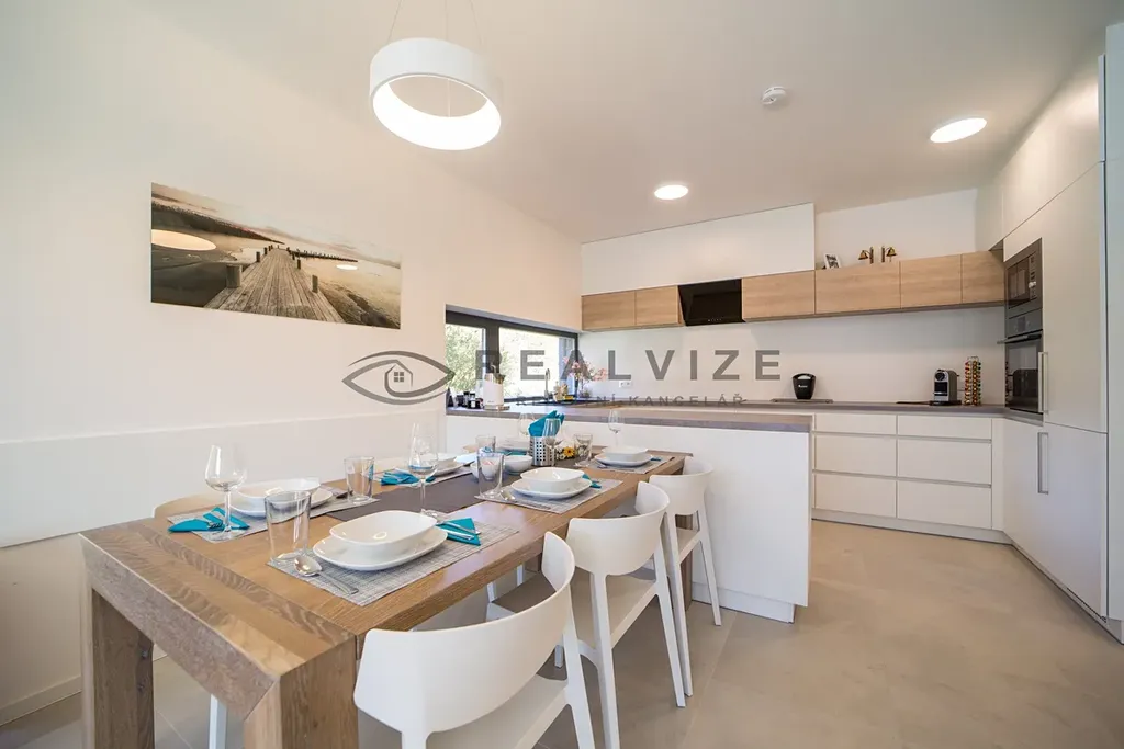 Technologie: Vytápění elektrickým podlahovým topením s možností dálkového řízení, fotovoltaika s akumulací, klimatizace, nabíječka na elektroauto, elektronický zabezpečovací systém, venkovní žaluzie.