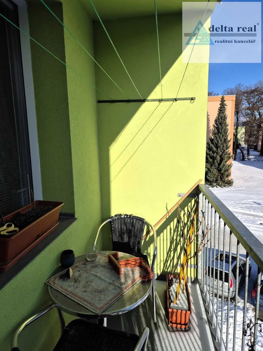 Dispozice: kuchyň 11,75 m2, obývací pokoj 16,18 m2 s balkónem 4,02 m2, 2x pokoj (14,21 m2 a 12,31 m2), komora 2,77 m2, dále koupelna s vanou 2,68 m2, samostatné WC 0,99 m2 a předsíň 8,38 m2. Okna byla vyměněna za plastová. Topení je centrální dálkové, ohřev vody elektrický bojler. K bytu patří sklep o výměře 3,22 m2.