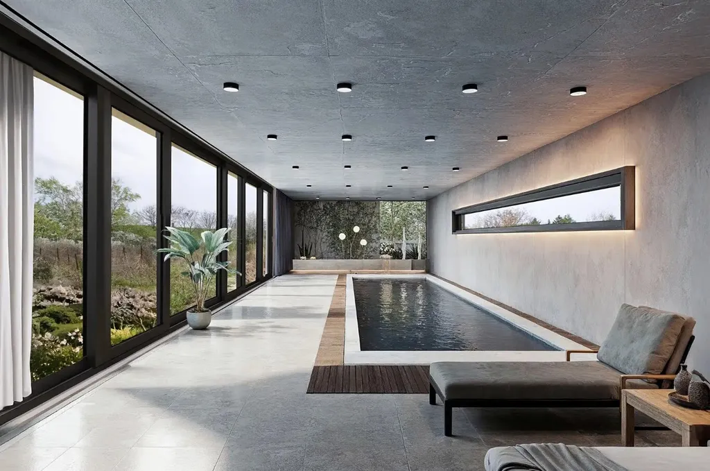 První patro (196 m²) bylo koncipováno jako noční a privátní část – najdete zde šest místností a dvě koupelny. Konstrukce domu navíc umožňuje vybudování pochozí terasy nad bazénem, s výhledem do zeleně, ideální pro relax nebo venkovní lounge zónu.