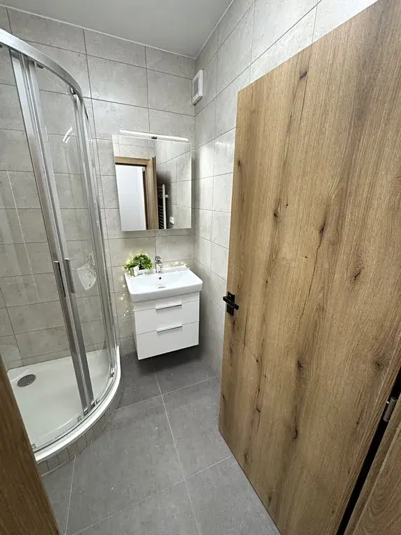 • koupelna s WC vybavená umyvadlovou skříňkou, umyvadlem, velkým zrcadlem a sprchovým koutem