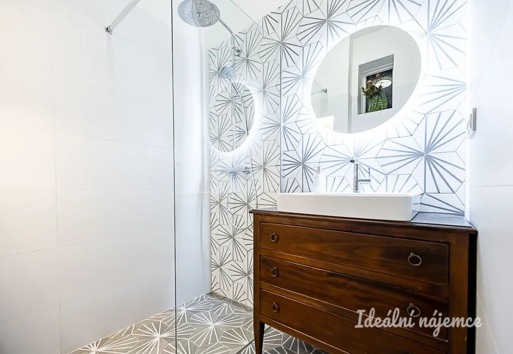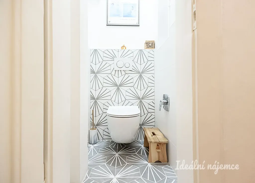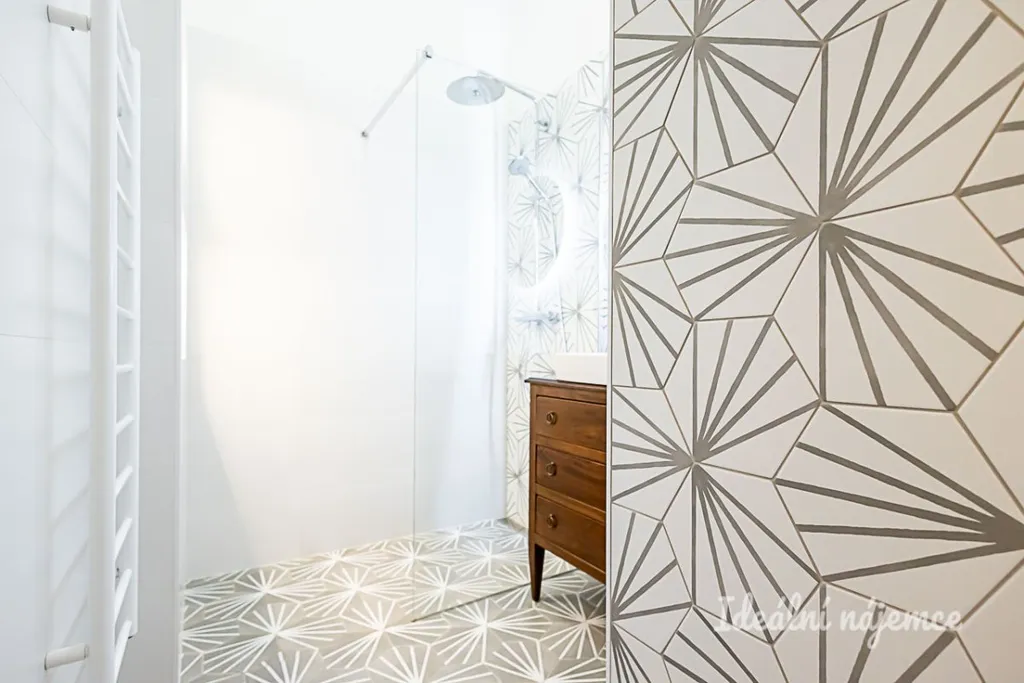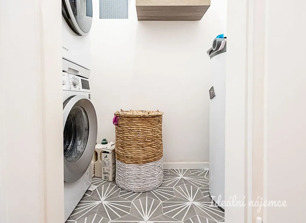 Dominantou vstupní části je centrální chodba s vestavěnou skříní, která přehledně propojuje celý byt. Nachází se zde samostatná koupelna se sprchovým koutem a stylovou restaurovanou skříňkou, oddělená toaleta a praktická komora sloužící jako technické zázemí (pračka, sušička, bojler).