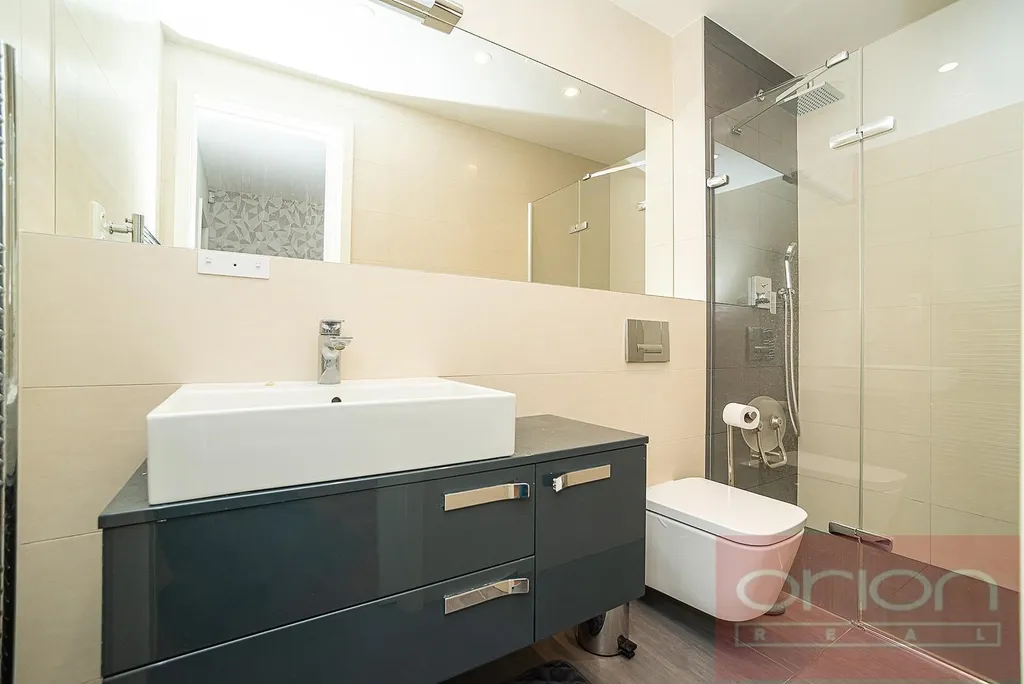 Nabízíme k pronájmu prostorný byt s dispozicí 3+kk s terasou umístěný v 1. patře moderní rezidenční novostavby Villa City View v Praze 5 - Smíchov. Byt s celkovou plochou 96,5 m² nabízí vstupní chodbu s úložným prostorem, obývací pokoj s jídelní částí a kuchyní a se vstupem na terasu, odkud je nádherným výhled na město, 2 ložnice, z toho hlavní ložnice má vlastní koupelnu se sprchou a toaletou, dále druhou koupelnu s vanou a toaletou. V ložnicích jsou vestavěné skříně, obývací pokoj je vybaven designovým policovým systémem. Moderní kuchyňská linka je vybavena spotřebiči, varnou deskou Küppersbusch se systémem Vok, lednicí s mrazákem, myčkou a troubou. Na podlahách jsou kvalitní parkety a dlažba. Byt je vybaven venkovními roletami ve všech pokojích, má bezpečnostní dveře, alarm a patří k němu jedno garážové stání v podzemní garáži, jedno venkovní parkovací stání a velký sklep. Dům je situován v klidné lokalitě Prahy 5, nabízí dostatek soukromí a příjemné bydlení. Výborné spojení autem a MHD k obchodnímu centru Anděl, kde je stanice metra a tramvají, do centra města, na letiště Václava Havla, do mezinárodních škol. Volný od 1.3. 2026, prohlídky po dohodě.