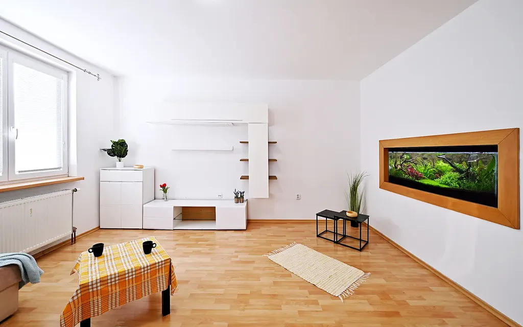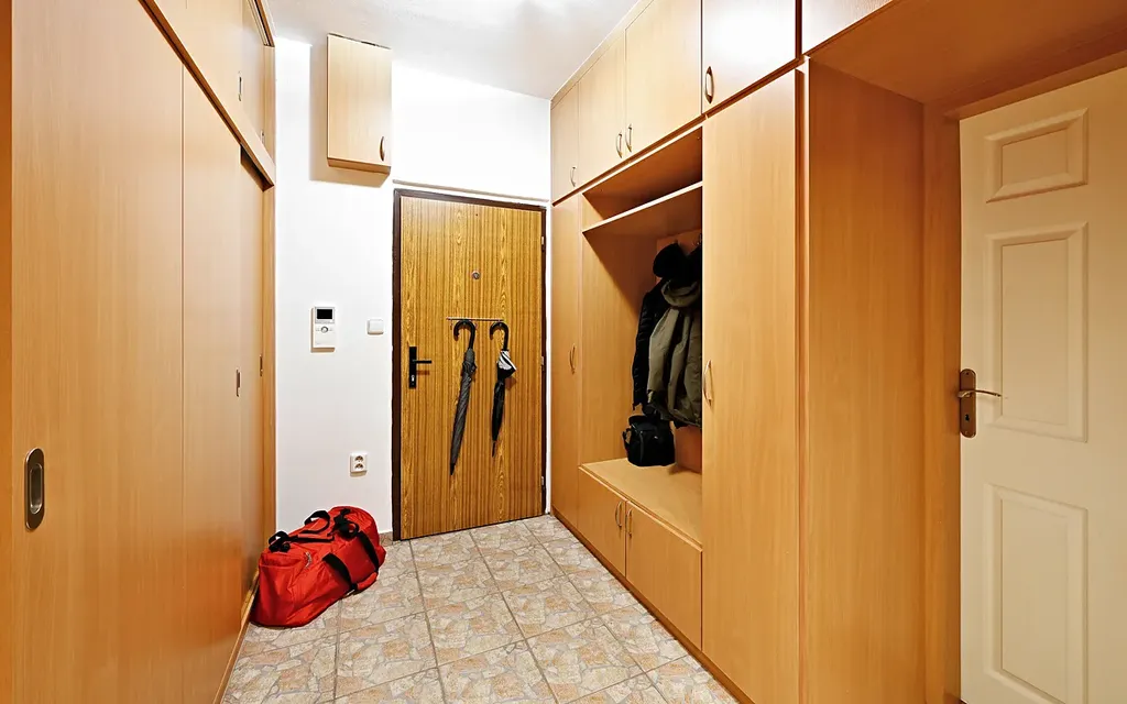 Byt se skládá z prostorné vstupní haly s vestavěnými skříněmi, na kterou navazuje spojovací chodba s velkorysým úložným prostorem. Z ní se vchází do obývacího pokoje s kuchyňským koutem a velkým zabudovaným akváriem, dále pak přes pracovnu na balkon. Z chodby se také dostanete do komory, samostatného WC a rozlehlé koupelny se dvěma umyvadly, vanou a WC. Na opačné straně bytu se nachází ložnice a další pokoj se samostatnými vstupy na zasklenou lodžii a s výhledem do zeleně. K dispozici je také druhá komora na společné chodbě.