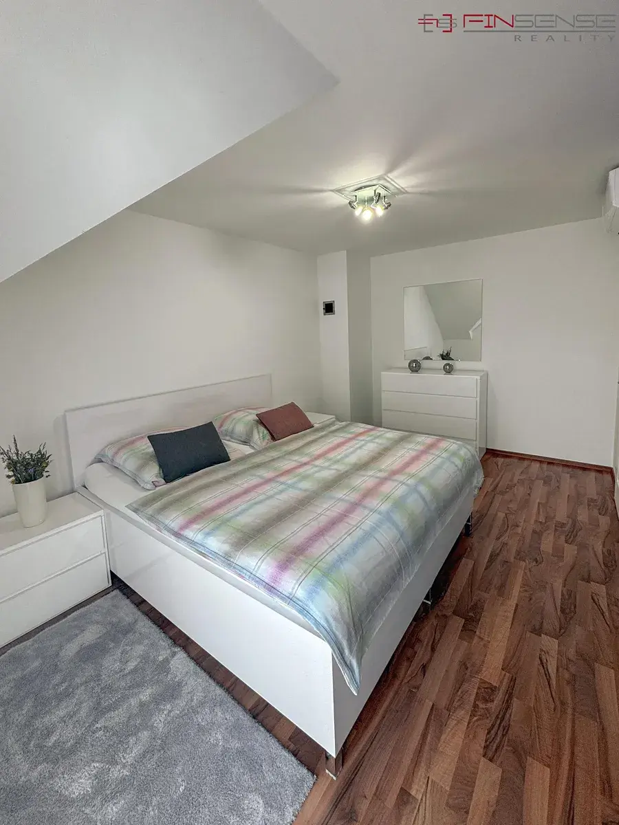 V patře se nachází malá chodba se skleněnými dveřmi, které umožňují uzavření horního patra z důvodu bezpečnosti a snížení hluku. K dispozici jsou dvě ložnice, každá vybavená manželskou postelí o rozměru 180 × 200 cm, nočními stolky a klimatizací Sinclair. Dále je zde samostatná velká šatna se zabudovanými skříněmi a druhá koupelna s rohovou vanou, WC, zabudovanými skříněmi a pračkou.