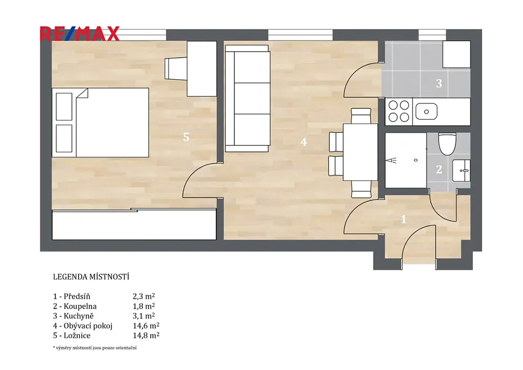 Dispozice bytu nabízí obývací pokoj (14,8 m2 ), ložnici (14,6 m2 ) s větší vestavěnou skříní, samostatnou kuchyní s menším oknem, koupelnou která je vybavená sprchovým koutem, umyvadlem a toaletou. K bytu dále náleží větší sklep o velikosti 5,3 m2.