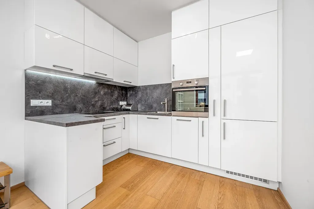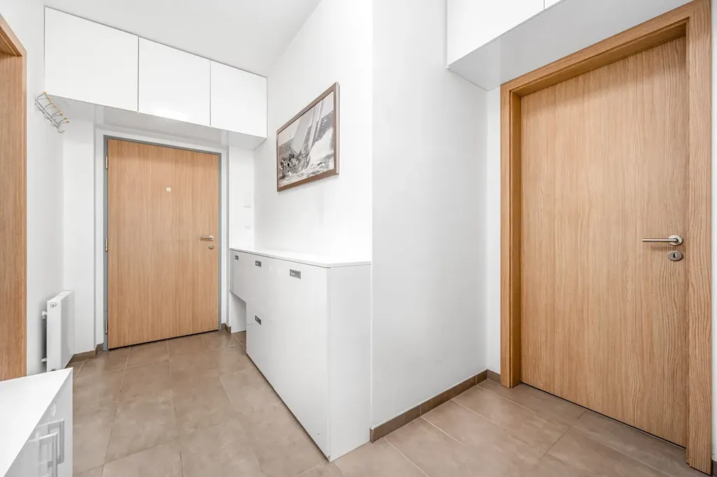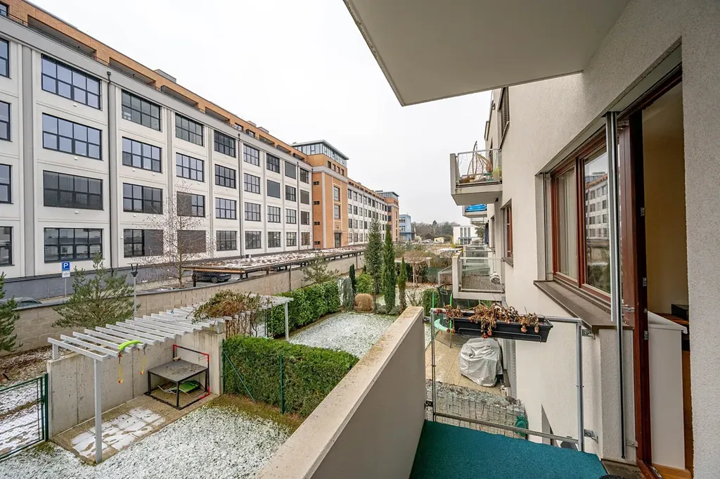 Dispozice je řešená přesně tak, jak má 2+kk fungovat. Obývací pokoj je propojený s plně vybavenou kuchyní, takže prostor působí vzdušně a v každodenním provozu dává smysl. Z obývací části je přímý vstup na balkon orientovaný do vnitrobloku. Ložnice je vybavena postelí a šatní skříní. Koupelna nabízí vanu, umyvadlo a toaletu. Velké plus je samostatná technická místnost s pračkou, sušičkou, bojlerem a plynovým kotlem — díky tomu zůstává koupelna čistá a bez provozního vybavení. Vstupní chodba má vestavěné úložné prostory.