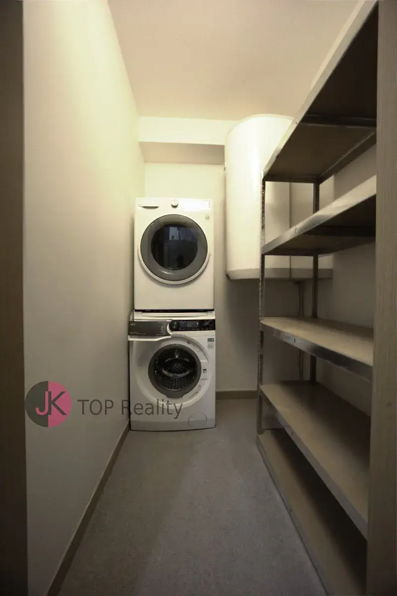 Byt je částečně vybavený – kuchyňská linka s vestavěnými spotřebiči (indukční varná deska, elektrická trouba, myčka na nádobí, digestoř), v koupelně vana, WC separátně, v ložnici vestavěné skříně, komora. Na podlaze plovoucí lamino a dlažba.
