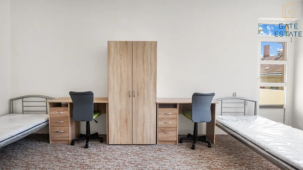 Oba dva pokoje jsou zařízeny - dvě postele, psací stůl a šatní skříň (viz fotografie). Pokoje jsou neprůchozí. V bytě jsou dvě lodžie a šatna.