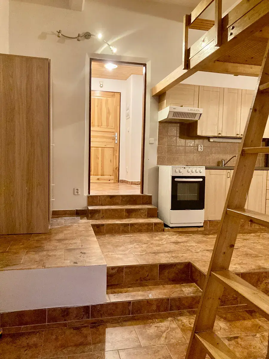 Nabízím k pronájmu byt orientovaný do vnitrobloku o dispozici 1kk o celkové ploše 25m2 plus spací patro v cihlovém činžovním domě na adrese Vrchlického 47/36, Praha 5 - Košíře.