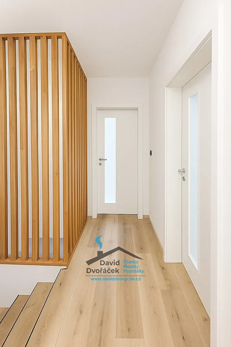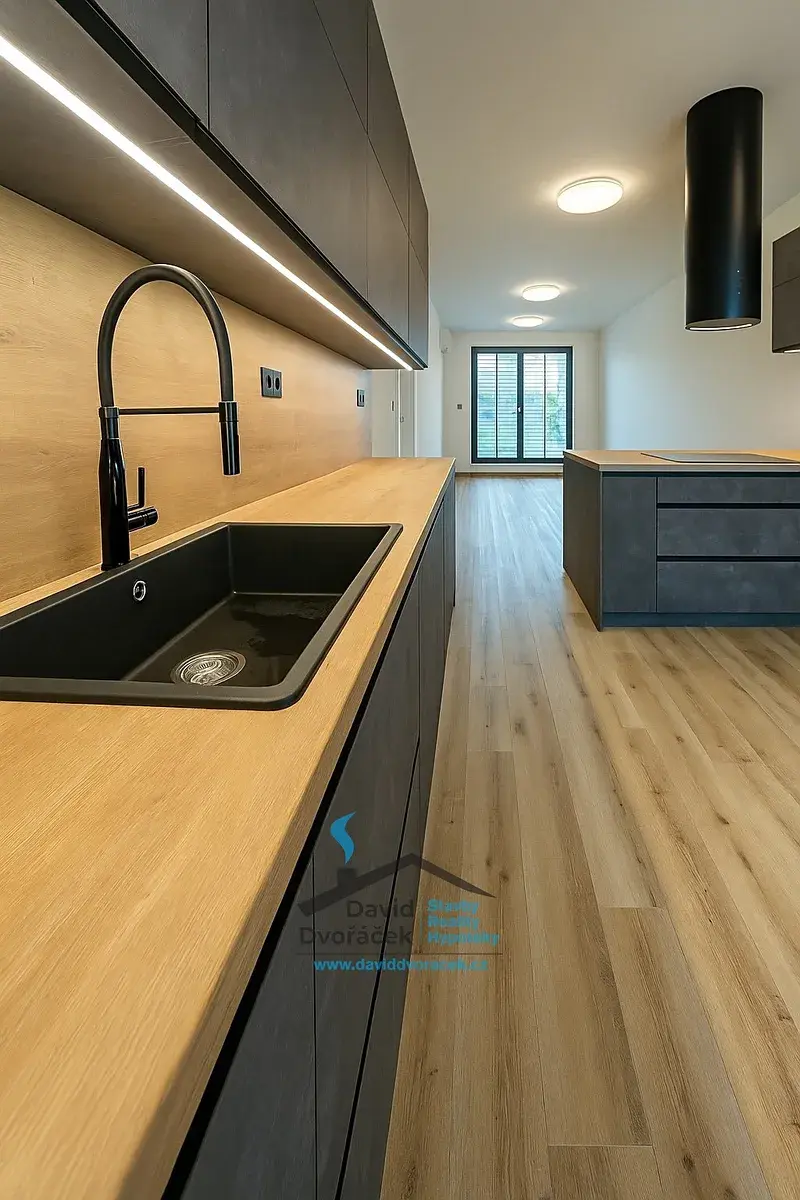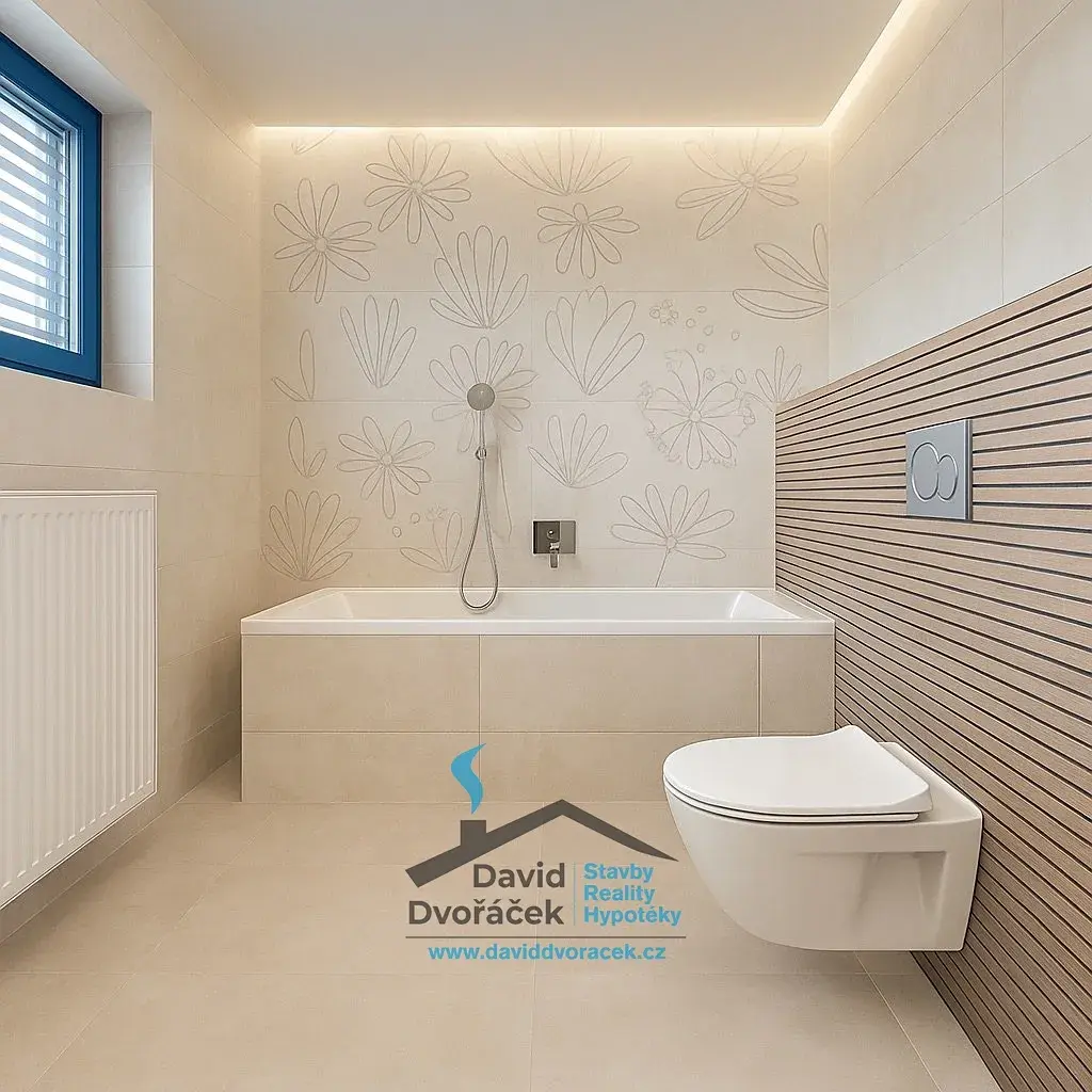 Interiér je řešen nadčasově a elegantně, s použitím prémiových materiálů a kvalitních technologií. Koupelny jsou vybaveny designovou sanitou, rektifikovanými obklady a podomítkovými bateriemi vyšší třídy. Kuchyň je vyrobena na míru a osazena značkovými spotřebiči s prodlouženou zárukou až sedm let. Celek působí klidně, reprezentativně a maximálně komfortně.