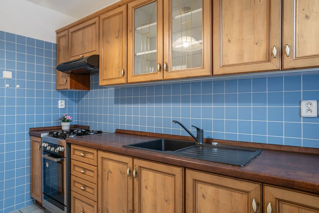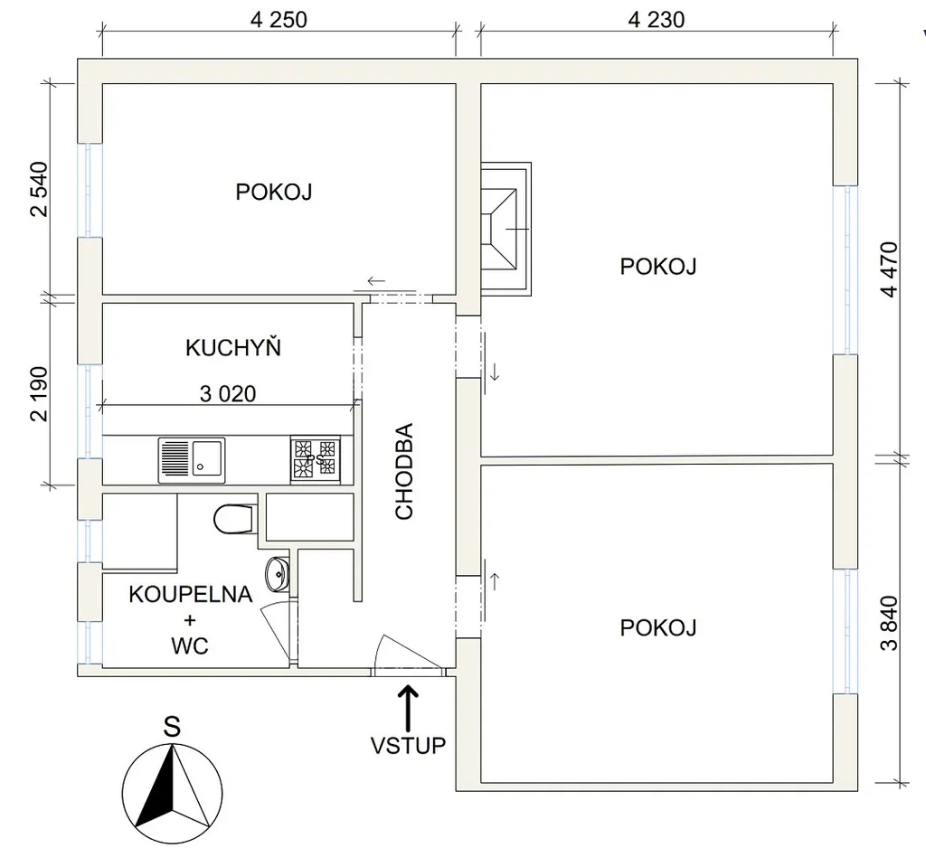 Uvnitř vás přivítají tři neprůchozí pokoje a světlá kuchyně, kam se pohodlně vejde i rodinný stůl.